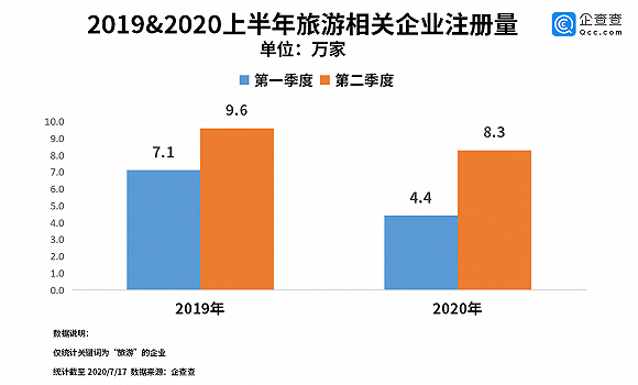 今年受疫情影响,旅游类企业新增数量有所下跌。企查查数据显示,今年上半年我国旅游类企业的注册量为12.7万家,同比下跌24%。其中受影响最大的第一季度注册量为4.4万家,同比下降62%。