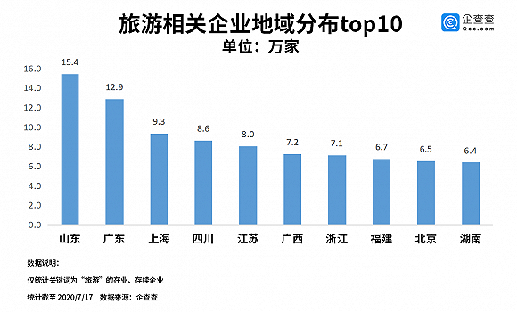 千呼万唤,终于等到“有序恢复跨省游”的好消息!近日,文旅部下方通知,在做好疫情防控工作的前提下,可恢复旅行社及在线旅游企业经营跨省(区、市)团队旅游业务。企查查数据显示,目前我国共有159万家旅游相关企业,其中山东以超过15万家的数据排名第一,其次为广东、上海、四川。受疫情影响,今年上半年相关企业注册量低至12.7万家,同比下跌24%。