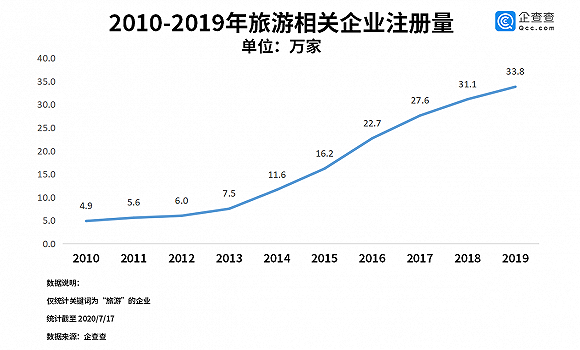 随着疫情影响逐渐减小,我国国内游限制措施进一步放开。企查查数据显示,目前我国范围内与旅游相关的企业数量达159万,从过去十年的数据变化来看,我国旅游类企业注册量逐年增长,2019年达到33.8万家,同比增长8.7%。