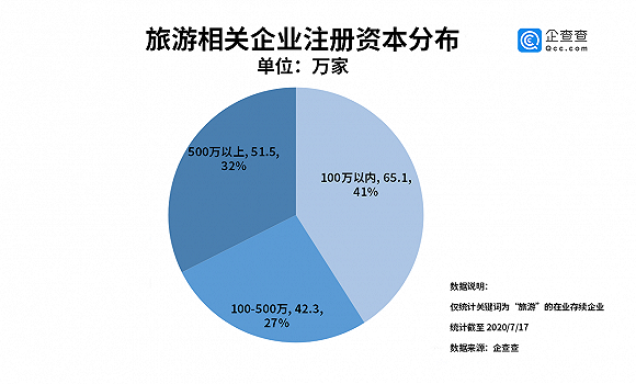 从企业注册资本分布来看,企查查数据显示,我国旅游类企业注册资本分布在100万以内的企业最多,共65.1万家,占比41%。