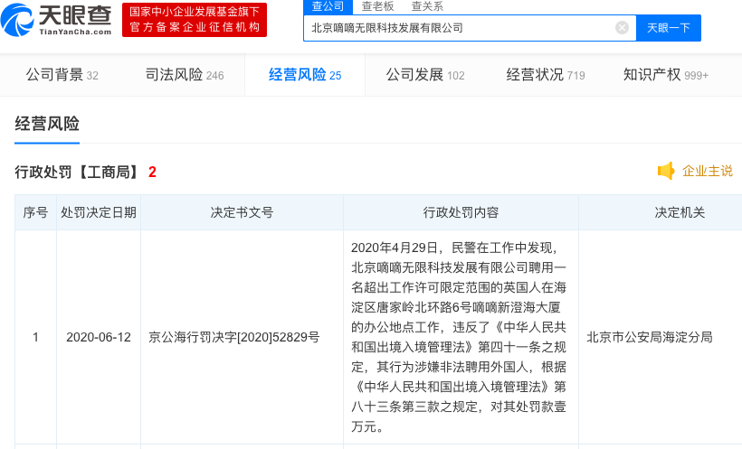 天眼查数据显示,近日,北京嘀嘀无限科技发展有限公司新增一条行政处罚信息,处罚决定机关为北京市公安局海淀分局。处罚内容为:2020年4月29日,民警在工作中发现,北京嘀嘀无限科技发展有限公司聘用一名超出工作许可限定范围的英国人在海淀区唐家岭北环路6号嘀嘀新澄海大厦的办公地点工作,违反了《中华人民共和国出境入境管理法》第四十一条之规定,其行为涉嫌非法聘用外国人,根据《中华人民共和国出境入境管理法》第八十三条第三款之规定,对其处罚款壹万元。