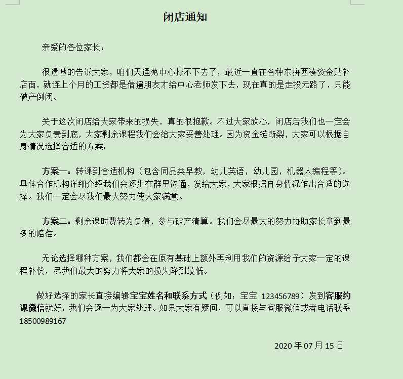 “最近一直在各种东拼西凑资金贴补店面,就连上个月的工资都是借遍朋友才给中心老师发下去,现在真的走投无路了,只能破产倒闭。”闭店通知上写到。据张琳提供的通知显示,落款日期为2020年7月15日,并没有署名。