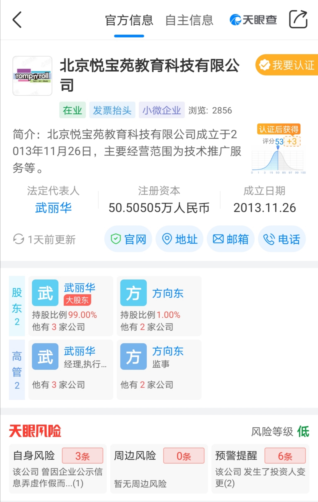 张琳的签约合同显示,悦宝园天通苑店的公司主体为北京悦宝苑教育科技有限公司。天眼查显示,该公司成立日期为2013年11月26日,法人武丽华,注册资本为50万人民币。