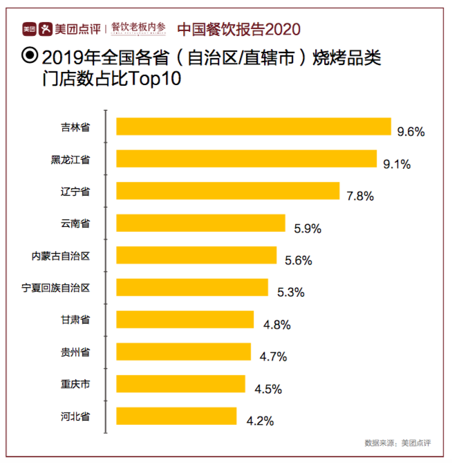 2019年全国各省(自治区/直辖市)烧烤品类门店占比Top10,来源:《中国餐饮大数据2020》