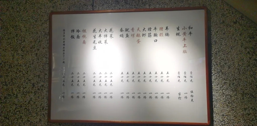 店内风格简洁实用,陈设、装饰都不花哨,白钢桌面,黄铜餐具,甚至连装订成册的菜单都没有,只有一个菜目表被装裱起来挂在墙上。