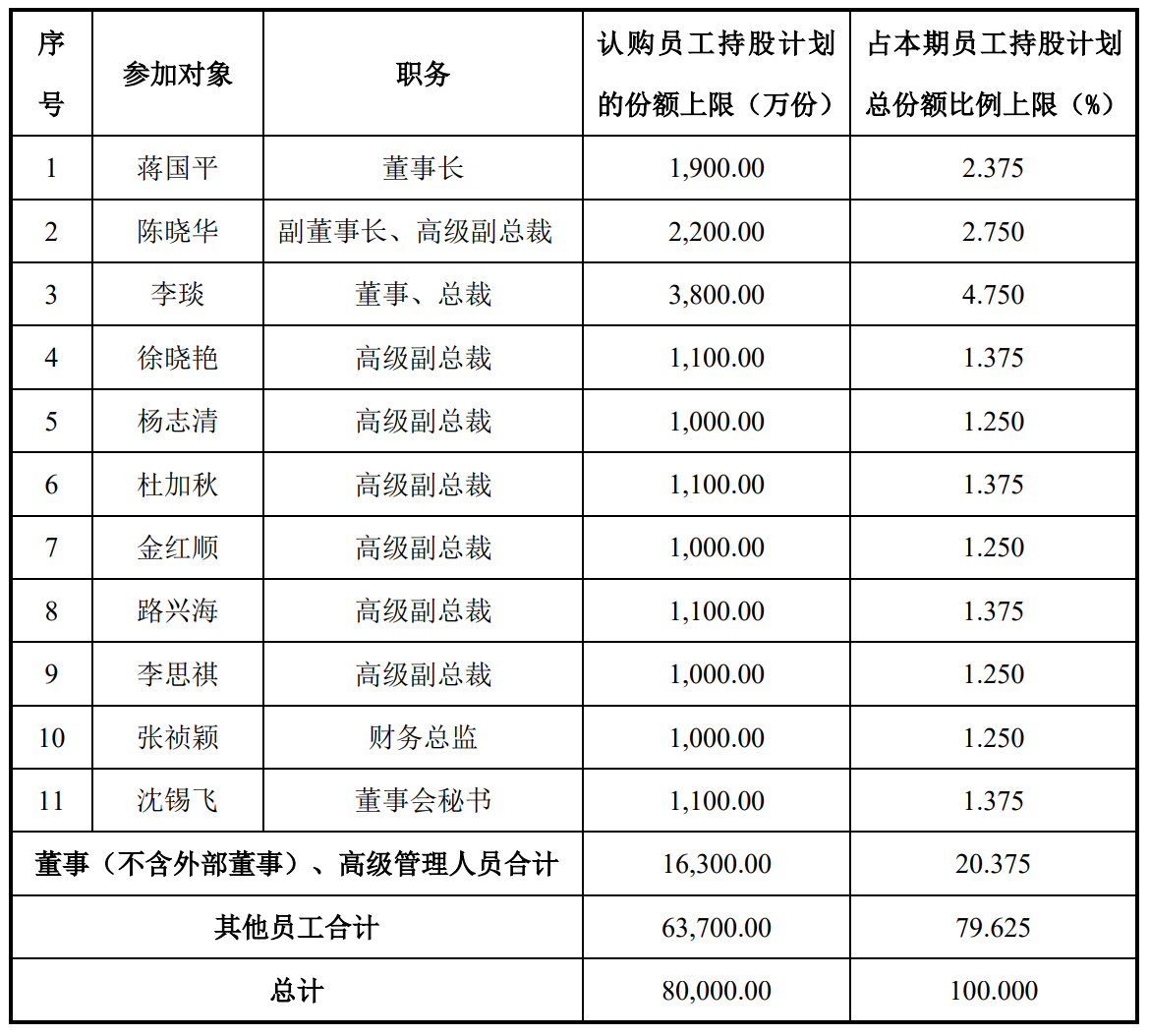 需要指出的是,7月20日晚海正药业还同步披露了第一期员工持股计划。据悉,出资参与该期员工持股计划的公司核心骨干员工共计不超过200人,其中包括公司董事(不含外部董事)、高级管理人员11人,分别为蒋国平、陈晓华、李琰、徐晓艳、杨志清、杜加秋、金红顺、路兴海、李思祺、张祯颖、沈锡飞;其他员工不超过189人。员工持股计划每1计划份额的认购价格为人民币1元,员工持股计划份额合计不超过8亿份,筹集资金总额不超过8亿元。其中,参加员工持股计划的董事和高级管理人员认购总份额不超过1.63亿份,占员工持股计划总份额的比例不超过20.375%;其他员工认购总份额不超过6.37亿份,占员工持股计划总份额的比例不超过79.625%。