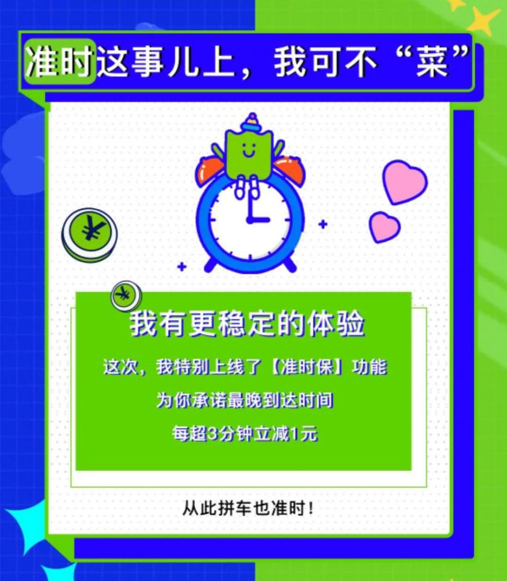 此次的青菜拼车可以说是2019年底全新拼车产品的一次品牌包装,但也不是换汤不换药。“青菜”最大的改进就是特别上线的准时保功能。此前,滴滴拼车的时长问题常常受人诟病。对于乘客来说,当减少的金钱成本远远不足以抵扣多付出的时间成本之时,拼车意愿将会大幅度下滑。对于车主方来说,知乎网友“铃风”就曾以滴滴车主的身份回答到,一旦遇上拼车单,只要有人在附近就得去接。虽然顺路,但是遇上堵车高峰,拼车模式并不会给司机计算时长费用,低速行驶费也比正常单要低,车主也不愿意接拼车单。