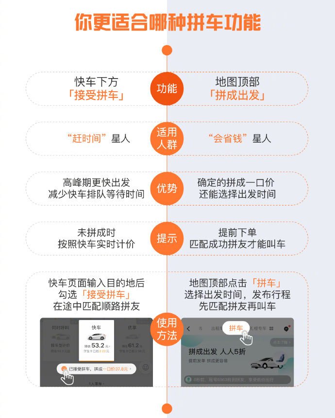2019年底,滴滴发布了全新拼车产品,并推出“123滴滴全民拼车日”。拼车单独形成一个“拼成出发”的界面,系统只有先匹配到了拼友才会为用户派车。原本的快车中也有“接受拼车”选项,但和“拼成出发”不同的是,在快车页面接受拼车,如果三分钟之内没有拼到人,则会直接分配快车。据媒体报道,与“拼成出发”相比,“接受拼车”即使拼成了也比五折要贵。滴滴拼车的逻辑算是越来越通顺了,让用户在性价比与时效性中找到了平衡。