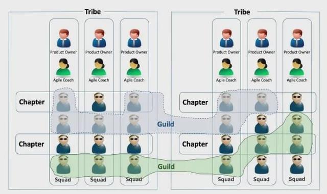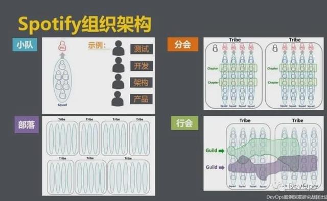 Spotify的研发组织分成了多个“Tribe部落”,分别负责共享的产品或顾客细分档案(音乐播放器、后台基础架构等)。每个部落的业务又被分成若干“Squad小队”(如搜索功能等功能特性小队、iOS等客户端APP小队、监控和运维等基础设施小队)。小队由5~7人自由组成,类似于一个“迷你的创业公司”,公司不任命管理者。他们对自己负责的那块产品进行改进、迭代以及发布更新版本。