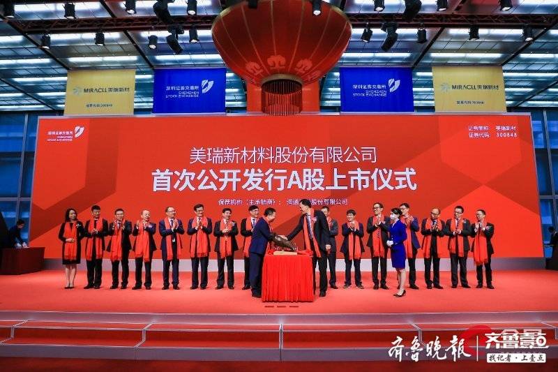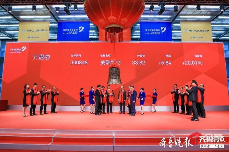 7月20日,齐鲁晚报·齐鲁壹点记者从烟台开发区党群工作部获悉,7月20日上午,烟台市委常委、常务副市长王中,烟台开发区工委委员、工委副书记刘建民,美瑞新材料股份有限公司董事长王仁鸿等人共同敲响了上市钟,美瑞新材料股份有限公司在深圳证券交易所正式挂牌交易(股票代码300848),成为2020年烟台市第一家登陆A股的企业,也是烟台市第40家A股上市企业。