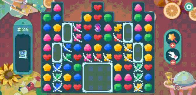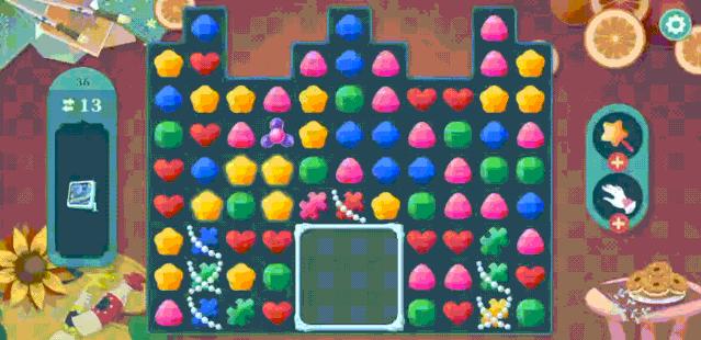 比如一般三消游戏都会通过不规则的关卡增加玩家的难度。《Rosetown Diary》也不例外,只不过某些关卡设计更加超脱,直接把场景切割开来,使得任务目标经常需要依靠玩家在其它场景中合成具有全局影响效果的道具(比如“风车”)才能进行消除。