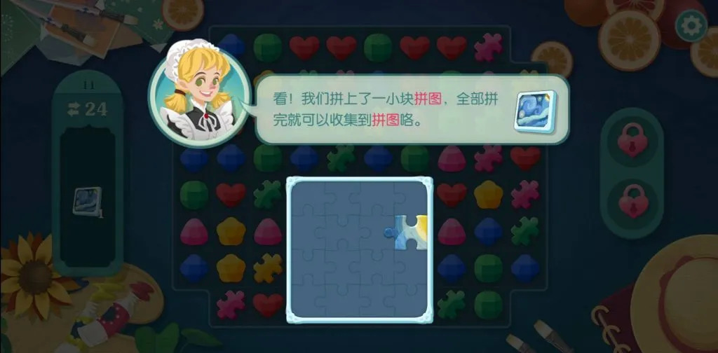 《Rosetown Diary》则用“拼图”来代替,玩家需要消除散落在关卡中的拼图碎片来填满任务区域,并且拼图一旦完成还会消失。这其实也可以看成是一种指定区域消除玩法,但具体形式确实不太一样。
