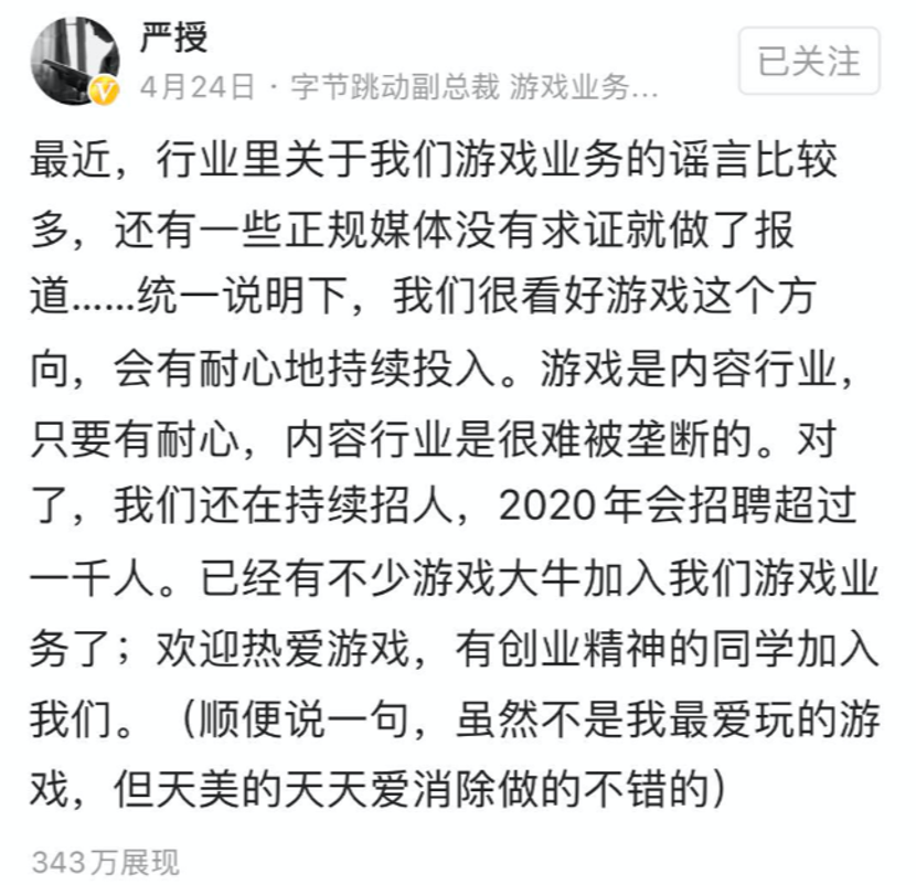 今年4月份,字节跳动副总裁、游戏业务负责人严授在微头条上发布了一则简讯,回应当时外界的谣言。