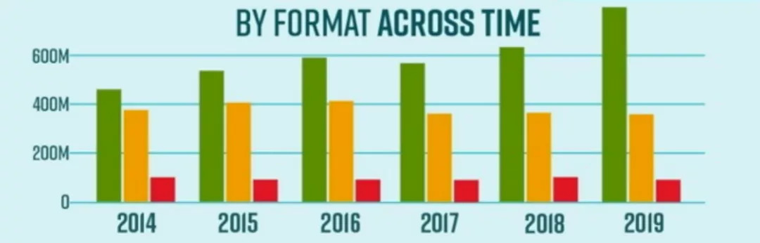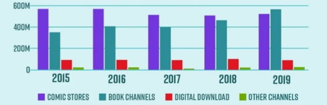 从销售渠道看,图书订阅渠道的收入首次超过了漫画实体店,在2019年达到了5.7亿美元的销售额。这都要得益于图像小说、儿童绘本的销售激增。
