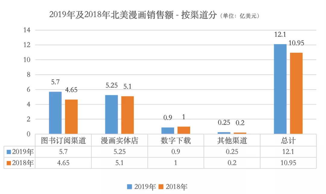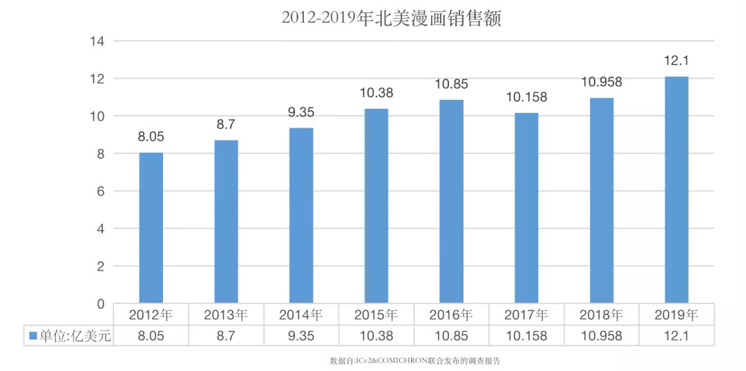2019年北美漫画总销售额12.1亿美元,同比上年的10.95亿元增长了11%。