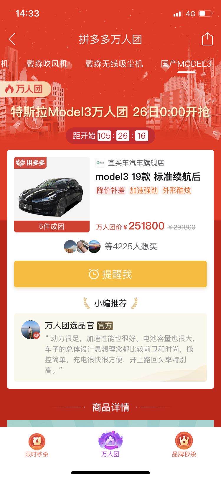 根据拼多多上的截图显示,这款特斯拉原价291800元,但在拼多多万人团中价格为251800元,比原价低了4万元人民币。目前已有4225人表示想买。