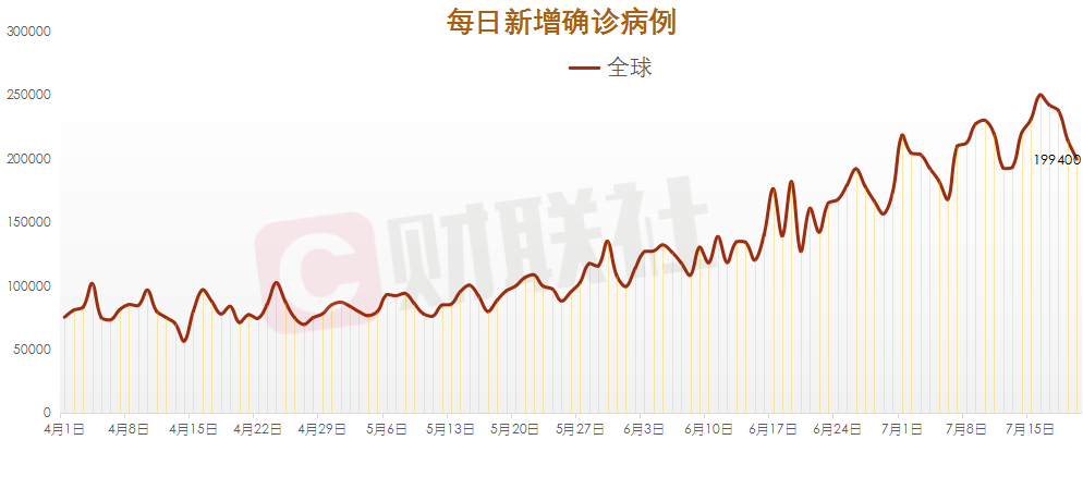 据美国约翰斯·霍普金斯大学的疫情统计数据显示,7月20日全天,全球新增新冠肺炎确诊病例19.94万例,单日新增数录得四连降;其中,美国新增新冠肺炎确诊病例6.04万例。截至北京时间7月21日14:40,全球累计确诊病例1470.53万例,累计死亡人数60.99万例。美国累计确诊383万例。