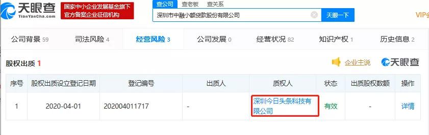 然而,独角金融(微信公号:Uni-fin)从天眼查发现,中融小贷公司在今年3月份的高管人员变更中出现了字节跳动高管的身影,比如近期就任中融小贷董事兼总经理的李冠超。公开资料显示,李冠超为字节跳动金融科技新业务负责人。另外,值得注意的是,中融小贷4月1日股权出质信息显示,质权人为深圳今日头条科技有限公司。