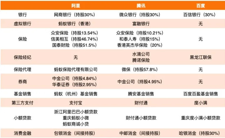同时,美团与滴滴等新晋的互联网巨头们也不甘落后,分别在第三方支付、银行、保险经纪、网络小贷等方面有所布局。