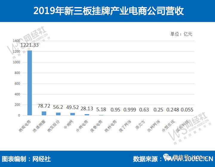 营收排名分别为:钢银电商1221.33亿元、浩德钢圈78.72亿元、钢宝股份56.2亿元、中钢网49.52亿元、中钢电商28.13亿元、报春电商5.18亿元、锦桥电商0.95亿元、搜了网络0.999亿元、信立方0.63亿元、讯网网络0.25亿元、中塑在线0.248亿元、滨兴科技0.055亿元。