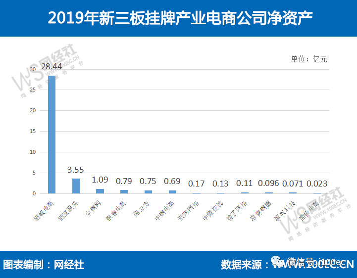 净资产上,2019年12家新三板挂牌产业电商公司净资产35.91亿元,平均净资产2.99亿元。分别为:钢银电商28.44亿元、钢宝股份3.55亿元、中钢网1.09亿元、报春电商0.79亿元、信立方0.75亿元、中钢电商0.69亿元、讯网网络0.17亿元、中塑在线0.13亿元、搜了网络0.11亿元、浩德钢圈0.096亿元、滨兴科技0.071亿元、锦桥电商0.023亿元。