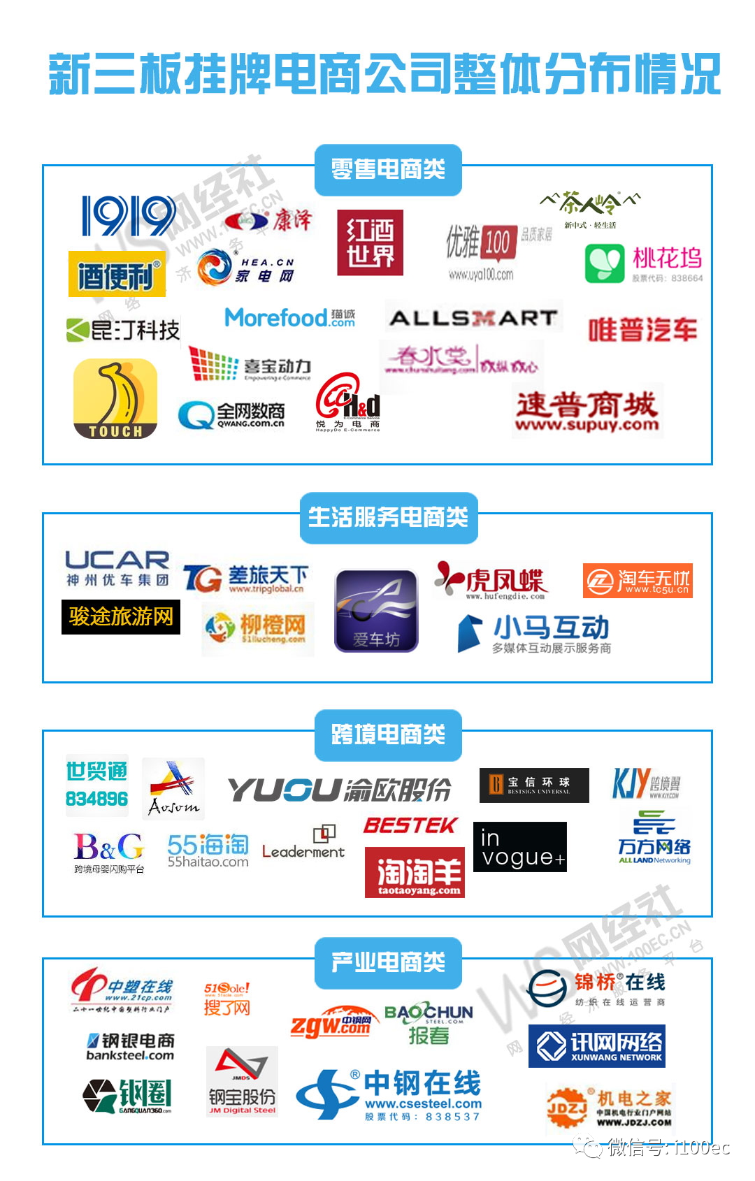 网经社“电数宝”(DATA.100EC.CN)电商大数据库监测显示,51家新三板挂牌电商公司具体包括:1)零售电商:壹玖壹玖、康泽药业、酒便利、家电网、猫诚股份、乐汇电商、昆汀科技、他趣股份、喜宝动力、红酒世界、全网数商、优雅电商、茶人岭、悦为电商、唯车电商、春水堂、奥斯马特、桃花坞、速普电商;2)跨境电商:世贸通、遨森电商、渝欧股份、宝贝格子、五五海淘、理德铭、百事泰、宝信环球、跨境翼、择尚科技、淘淘羊、万方网络;3)生活服务电商:神州优车、骏途网、差旅天下、虎凤蝶、留成网、淘车无忧、小马科技、爱车坊;4)产业电商:钢银电商、浩德钢圈、钢宝股份、中钢网、中钢电商、报春电商、锦桥电商、搜了网络、信立方、中塑在线、讯网网络、滨兴科技。