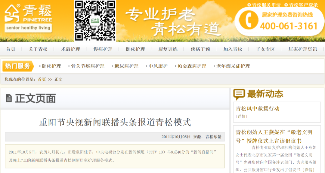 在2004年那个时代,“青松”带着创始人的光环、全新的功能性康复护理理念、以及国内最专业的居家照护团队,曾被视为中国养老商业模式成功的典范,分别在2010年、2014年、2016年完成了从天使轮到B轮的千万级融资,获得资本的一致认可,中央电视台更是多次报道“青松模式”。