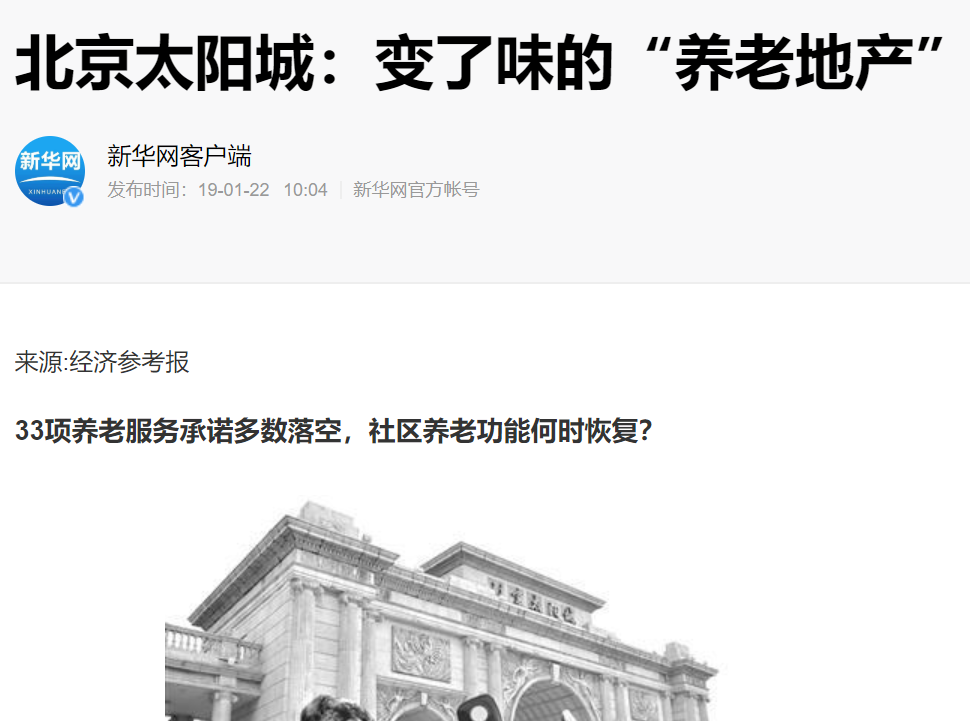 然而,这似乎也成为了太阳城最后的高光时刻,2019年1月22日,《经济参考报》刊发题为《北京太阳城:变了味的“养老地产”》的深度报道:医院停业、配套消失、服务缺失、官司缠身、资金链断裂,太阳城一时被推到风口浪尖,至今依然无解。