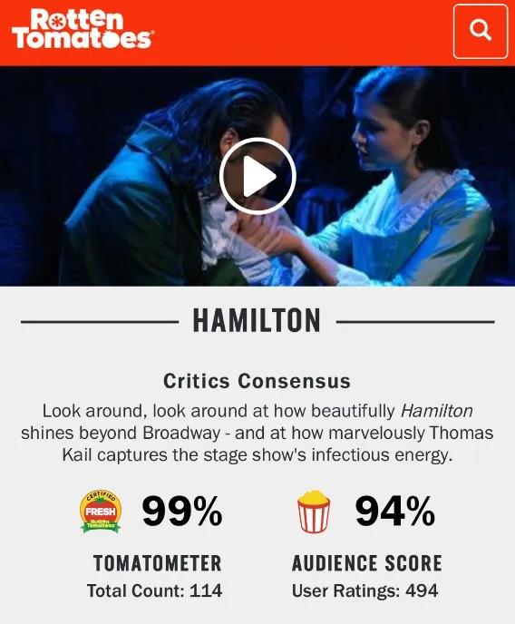 今年7月3日,音乐剧《汉密尔顿》官摄电影版在Disney+流媒体开播,直接获得年度最高分口碑。