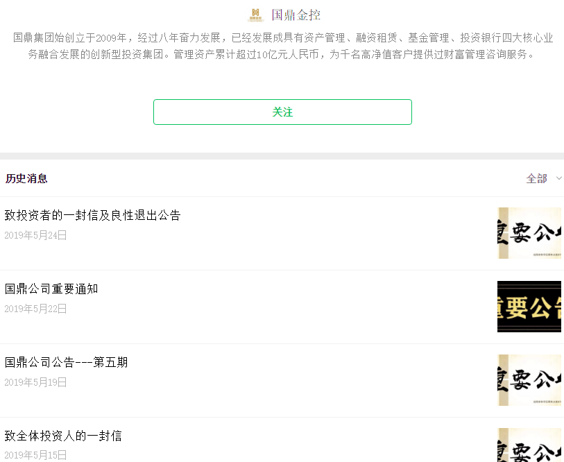 2019年5月24日,据国鼎公司注册的微信公众号“国鼎金控”发布的《致投资者的一封信及良性退出公告》显示,“从这场金融风暴来临,国鼎公司停止金融业务至今,已将近两个月。”同时,该公司提供了资产补偿和三年期现金兑付两个计划供投资者选择。此后,该公众号未再更新。