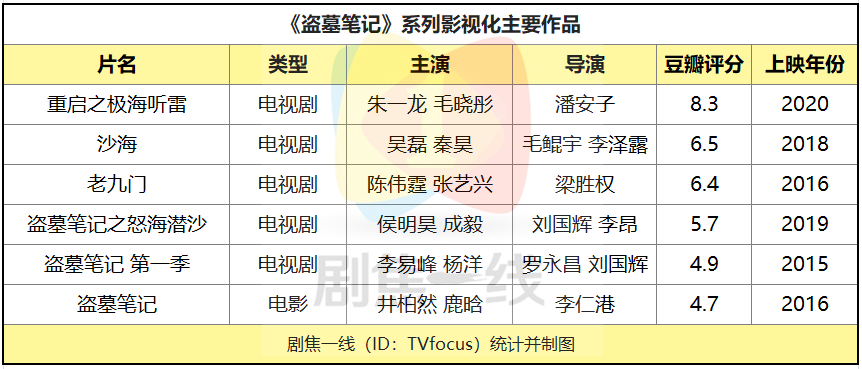 但是在影视化的道路上,《鬼吹灯》系列改编的影视剧无论是数量还是整体的质量上都与《盗墓笔记》改编的影视剧拉开了差距。