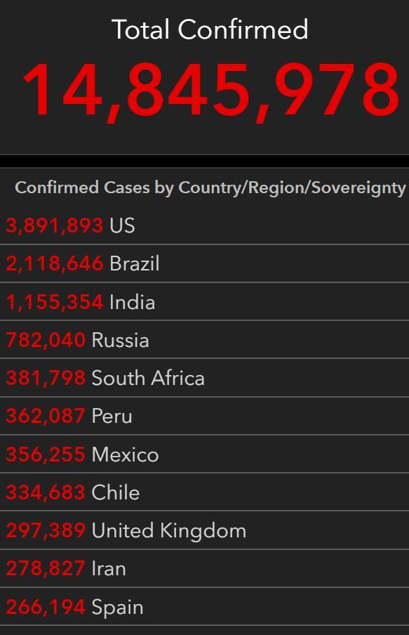 约翰·霍普金斯大学的统计数据显示,截至北京时间7月22日上午8时,全球累计确诊新冠肺炎病例14845978例,死亡613879例。
