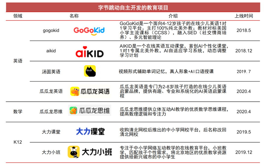 相比于流量焦虑的在线教育企业,占据流量高地和字节跳动和快手俨然不缺少入局的理由。正如前面所提到的,快手已经开始在流量上扶持教育类账号,字节跳动的动作则更为直接:gogokid、AIKID和大力课堂前赴后继,汤圆英语、瓜瓜龙英语等产品同步上线,并且参与投资了十余家在线教育企业,业已成为字节跳动的战略级扩张方向。