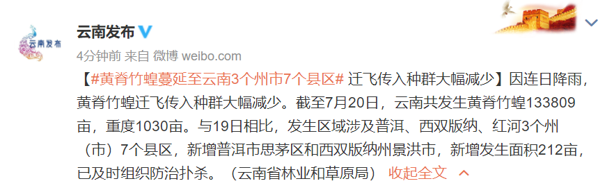 据云南发布消息,因连日降雨,黄脊竹蝗迁飞传入种群大幅减少。截至7月20日,云南共发生黄脊竹蝗133809亩,重度1030亩。与19日相比,发生区域涉及普洱、西双版纳、红河3个州(市)7个县区,新增普洱市思茅区和西双版纳州景洪市,新增发生面积212亩,已及时组织防治扑杀。