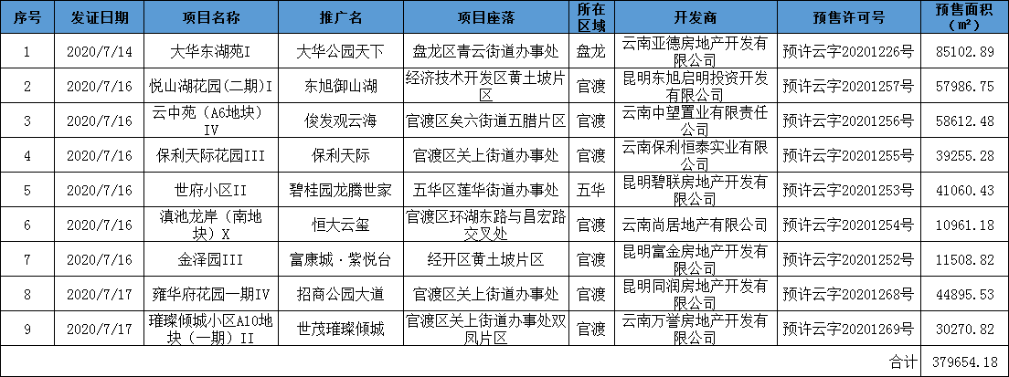 与前两月超百万方的预售增量相比,7月份预售证发放节奏有所放缓。截至上周,7月份昆明主城四区和呈贡共发放预售证19张,新增预售面积累计约65万方。