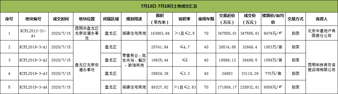 与前一周相比,上周昆明土地成交面积持续下滑,但成交金额却有所上涨。上周本地仅盘龙区一区有5宗土地挂牌到期,且均成功交易,总面积约480亩,成交金额约59亿元。