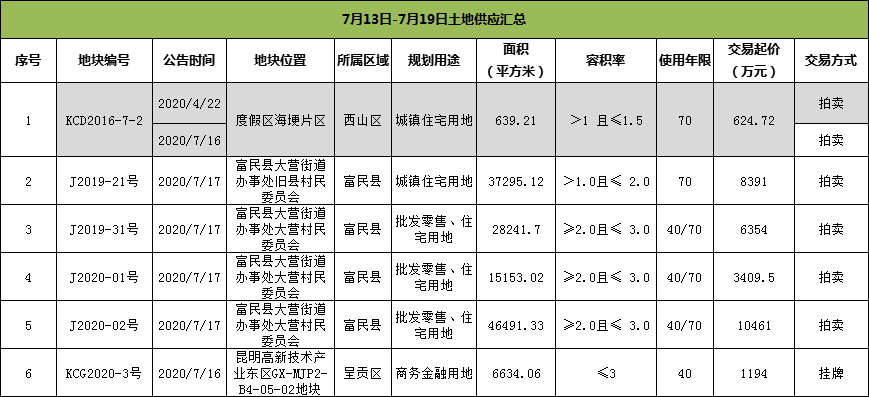 另外4宗位于富民县大营街道办事处旧县村民委员会,面积约191亩的居住及混合用地,交易起价约2.7亿元,住宅起始楼面价约1125元/㎡。