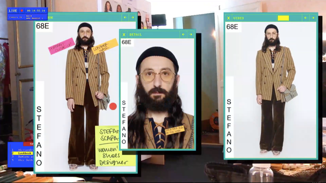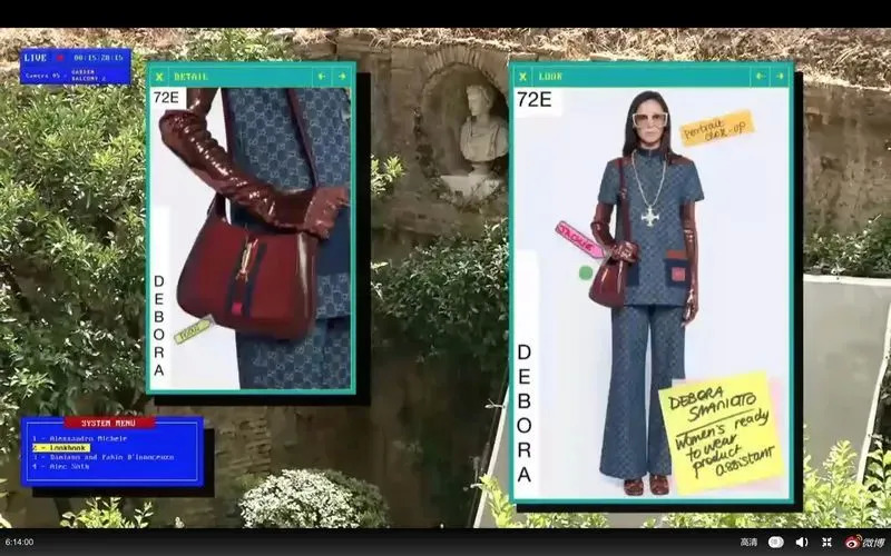 时装秀部分也依旧以复古电子感的画面进行直播呈现,而除了直播秀之外,观众还可以看到整场直播秀的施工布展、模特闲聊,观众可以进入到每一个房间,深入体验整场发布会的全过程。