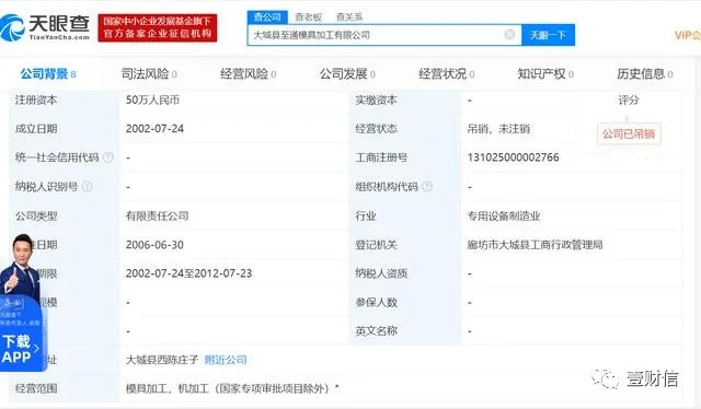 天眼查也显示,至通模具的法定代表人为李凤朝,注册资本50万元,李凤朝和秘志需分别认缴40万元、10万元,成立于2002年7月24日,2006年6月30日核准,营业期限至2012年7月23日,经营状态为吊销未注销。此外,李凤朝还投资了另一家大城县龙燊模具加工有限公司,持股80%,未担任法定代表人,状态为存续。