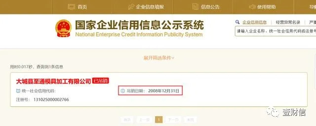 但令人惊奇的是,据国家企业信用信息公示系统显示,至通模具早在2008年12月31日就已被吊销了营业执照。
