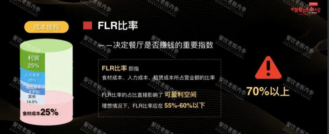 卢南提出用FLR比率来衡量餐厅的亏损情况。影响FLR比率的食材、人力、租金,正是餐饮行业的“三高”压力所在。FLR比率超过70%,门店很可能处于亏损状态。