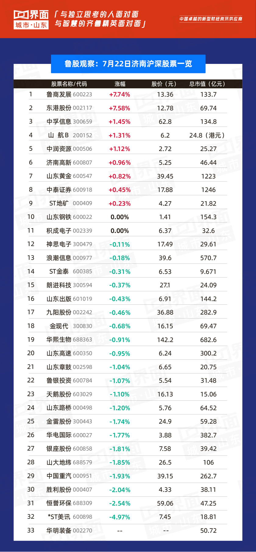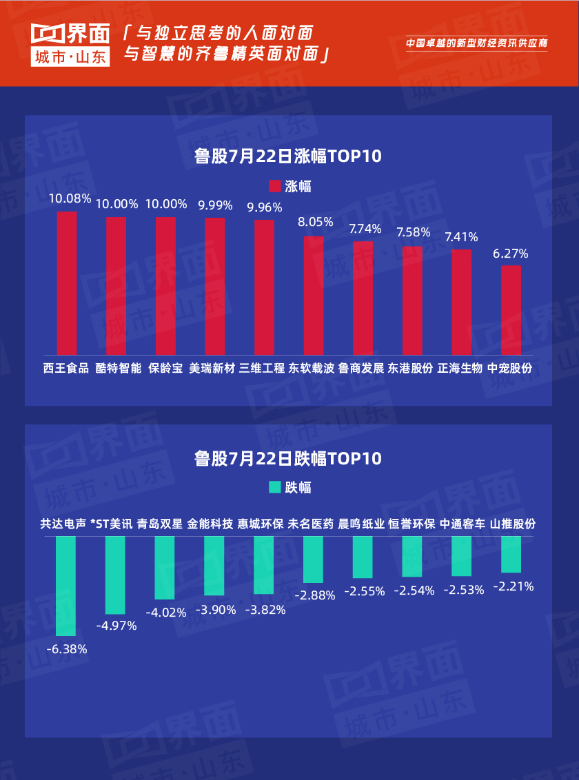 今日鲁股总结:7月22日,山东省内沪深股票有92只个股上涨,110只下跌,13只与上一个交易日收盘价持平;