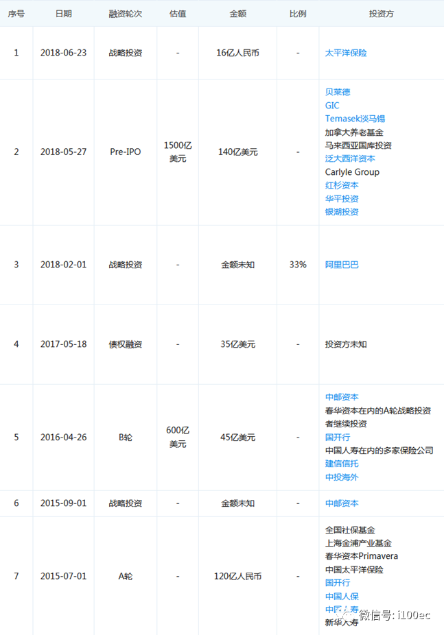 根据企查查数据显示,2015年7月,蚂蚁集团宣布完成120多亿元人民币A轮增资;2015年9月5日,获中邮资本战略投资;2016年4月,蚂蚁集团完成总额超过45亿美元B轮融资,由建行旗下中投海外和建信信托、中国人寿、中邮集团等机构参投;2018年2月,阿里巴巴与蚂蚁集团联合宣布,根据2014年双方签署的战略协议,并经阿里巴巴董事会批准,阿里巴巴通过一家中国子公司入股并获得蚂蚁集团33%的股权;2018年5月27日,蚂蚁集团宣布完成140亿美元Pre-IPO轮融资;2018年6月,蚂蚁集团再次获得太平洋保险16亿元战略投资。