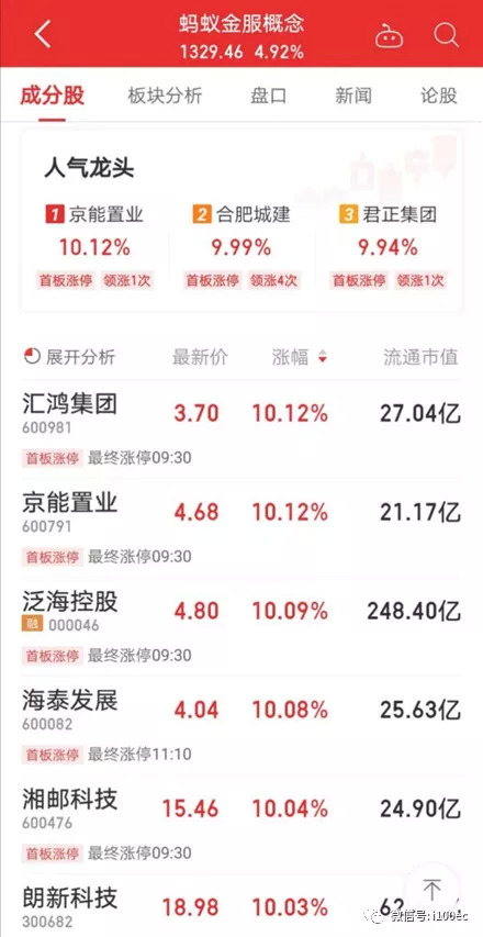 此外,受蚂蚁集团上市消息利好,蚂蚁集团相关股掀起涨停潮。7月21日,京能置业、汇鸿集团、海泰发展、湘邮科技、朗新科技等十余只个股均现一字涨停。