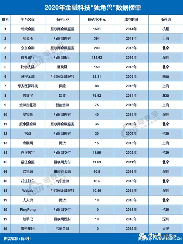 金融科技发展至今,也诞生诸多“独角兽”。据网经社“电数宝”(DATA.100EC.CN)电商大数据库显示,蚂蚁集团以超1600亿美金的估值位列第一位,此外,互联网巨头孵化的金融科技知名“独角兽”还有京东数科(200亿美金)、苏宁金融(92.31亿美金)、度小满金融(36亿美金)等。