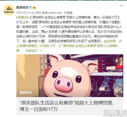 日前,刷微博的朋友应该多少在首页中看到了下面这个表情丰富的“猪头”,以及他用无比欢乐的语气描述“有味道”的部队生活。除了《部队那些没什么人知道的事儿(十四)》这一则视频内容之外,原作者“左拆家”的其他视频内容播放量,在其他平台上的播放量也都呈现出迅速上涨的趋势,博主更是在一天内涨粉多达17万。