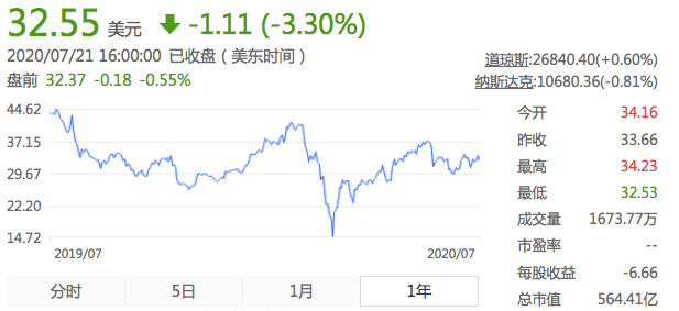 Uber近一年股价走势,图源东方财富网