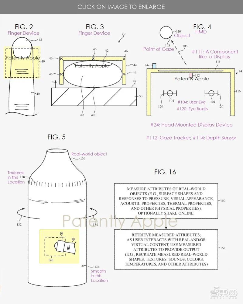 这次申请的手指设备类似一个环状贴纸,搭载了能感受到力、图像等的传感器,因此当使用者在与现实世界对象交互时,可以通过一个甚至多个传感器感觉与现实世界对象的物理信息。