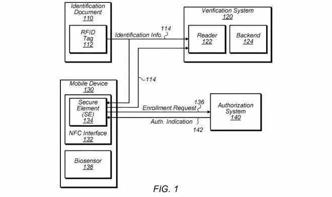 这一专利描述了可以利用iPhone的诸如NFC(近场通信)或RFID(射频识别技术)的短距离无线电功能,来存储嵌入集成电路内的人员身份凭据。