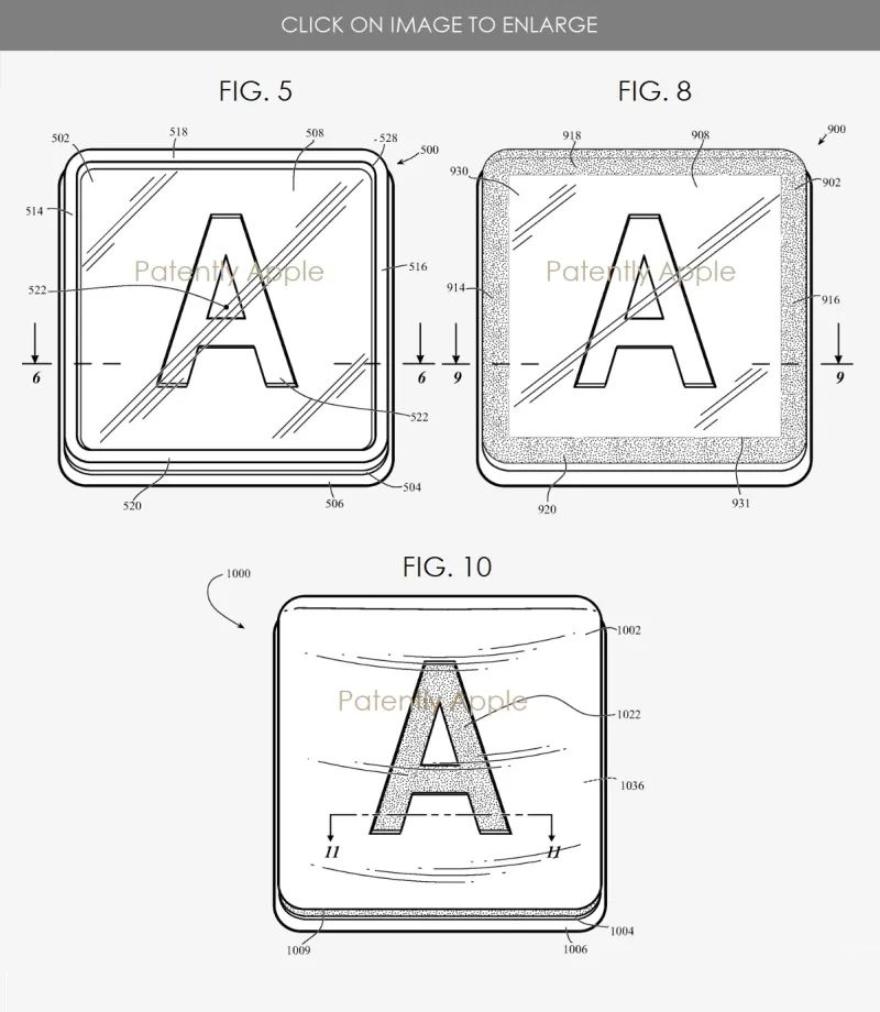今年的7月2日,美国专利商标局发布了苹果的“透明键帽”专利申请,新专利的键帽采用了全透明的设计方案,将会采用玻璃、全透明陶瓷、蓝宝石玻璃等全透明或透明色材料制作。这类材料制作的键帽具有高弯曲刚度和抗压强度,即便将键帽做得再薄也不用担心会弯折变形。此外,“玻璃键帽”的表面将会经过抛光,因此还可以避免刮擦而产生瑕疵。